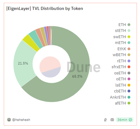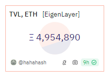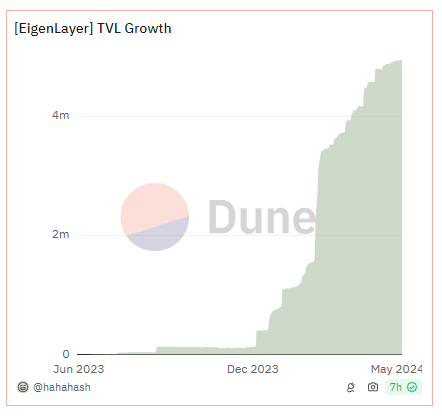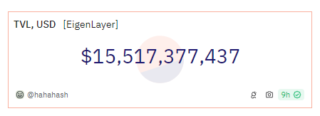 Para empezar Eigen Layer tiene un TVL de 15.500 millones. Esto significa que tiene capturado casi 5 millones de ether en staking. Espectacular.