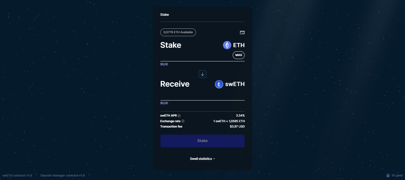 Conecta tu wallet y ahora suponiendo que tienes ether en tu wallet, lo vamos a poner en staking para recibir nuestro primer LST de Swell, el liquid stake token swETH en un ratio 1:1.