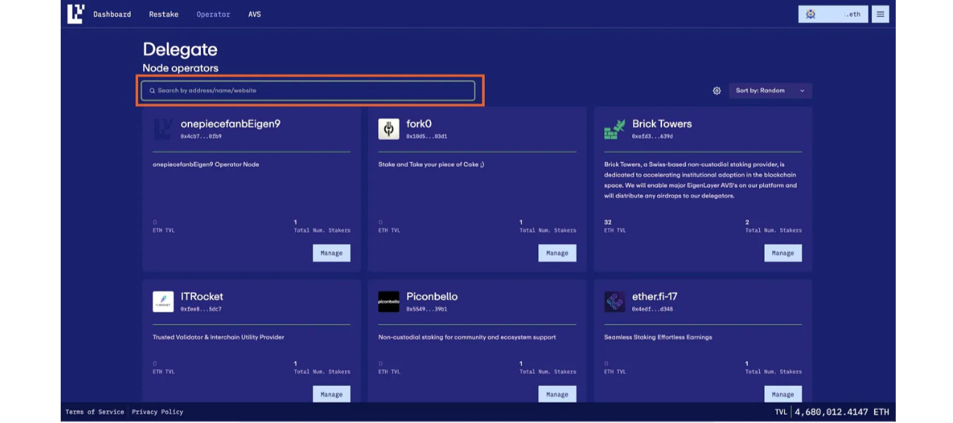 Delegación en EigenLayer: característica que permite a los repartidores que poseen $ETH o liquids tokens delegar sus activos a otras entidades que operarán contenedores de software offchain de módulos de servicio creados en EigenLayer, en lugar de operar el software ellos mismos.