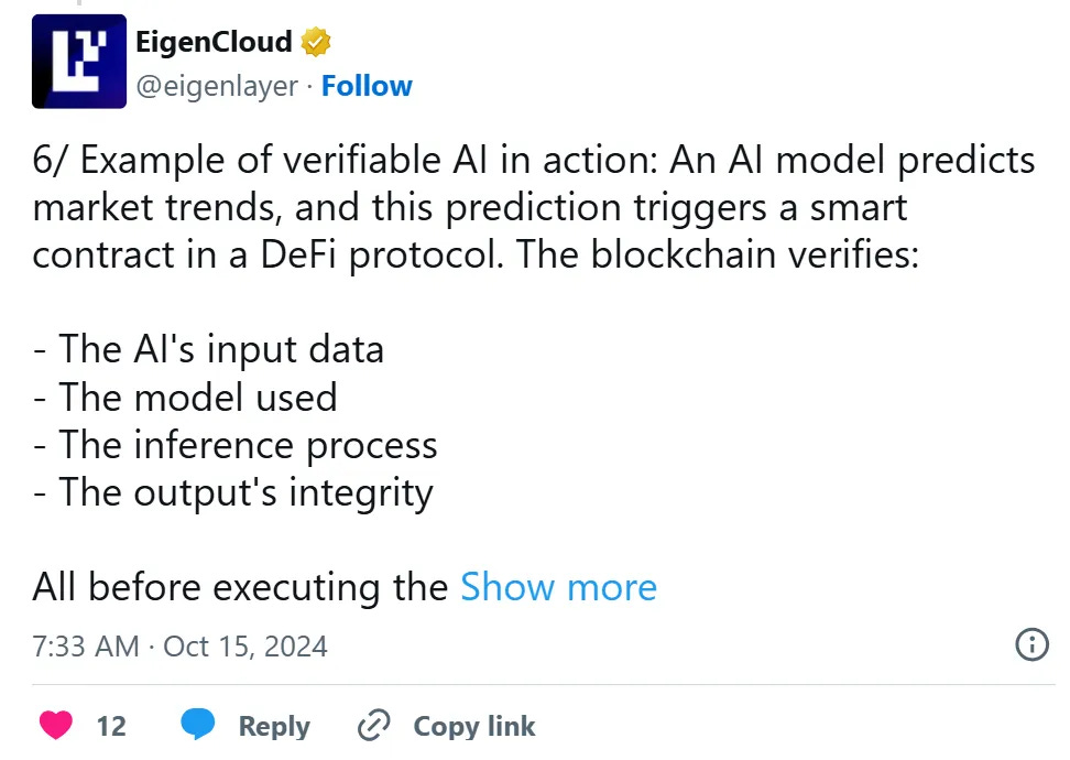 Esto permite que los desarrolladores ejecuten Agentes de IA sofisticados offchain y simultáneamente certifiquen su corrección mediante penalizaciones económicas por errores, auditorías continuas y, en perspectivas futuras, pruebas de conocimiento cero (zk-proof).