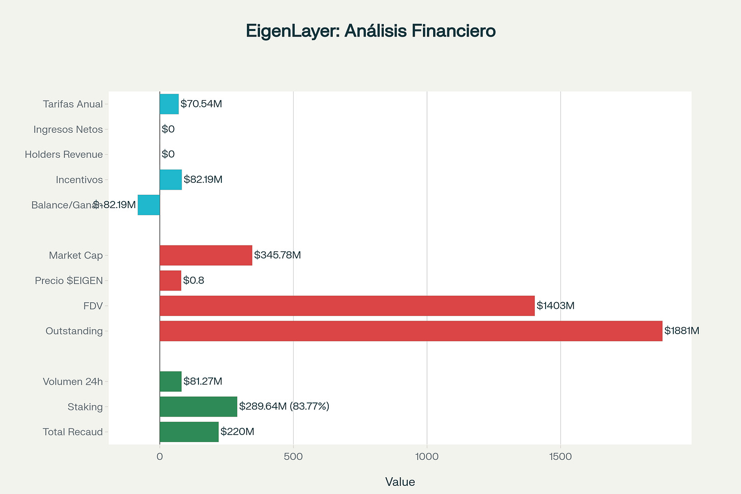 La capitalización de mercado del token $EIGEN es de 345.78 millones, con un precio actual de 0.8 USD, bajo en comparación con el valor bloqueado (TVL), posiblemente por la gran cantidad de tokens en staking o baja circulación. La valoración completamente diluida (FDV) es de 1.403 millones y la outstanding FDV de 1.881 millones, incluyendo tokens que podrían liberarse en el futuro.