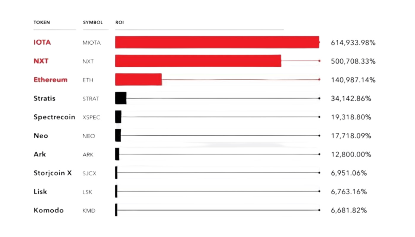 El gráfico muestra el retorno de inversión (ROI) en porcentaje de varios activos desde su lanzamiento hasta el momento del análisis que fué Diciembre de 2017. Los tres activos con mayor ROI fueron $IOTA, $NXT y Ethereum, que presentaron revalorizaciones extraordinarias: