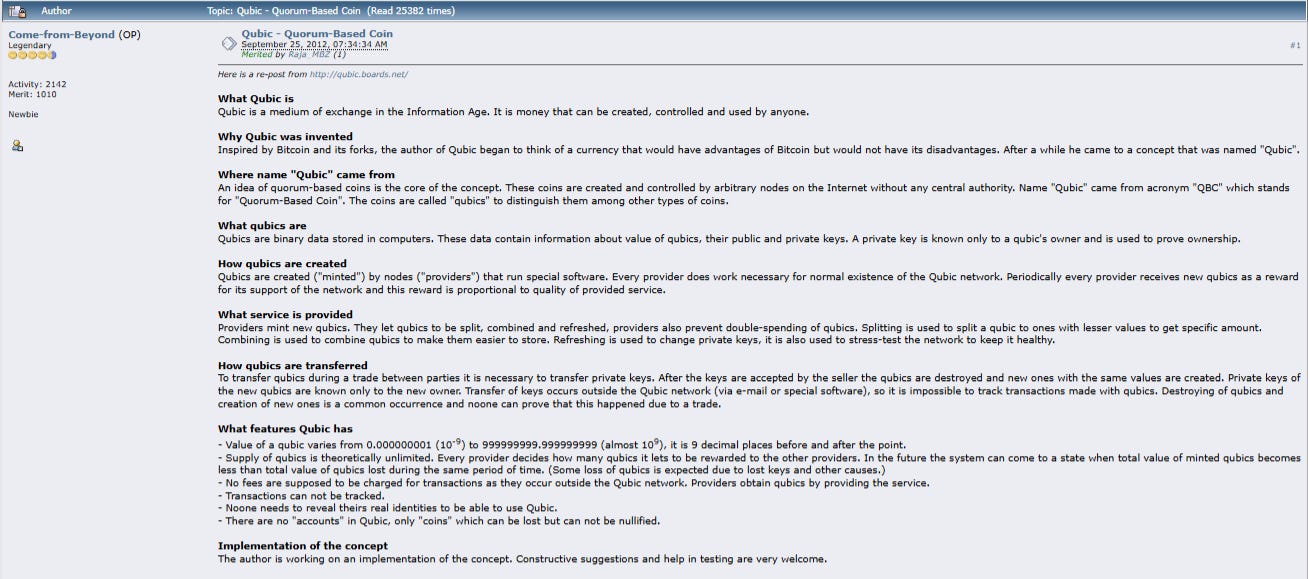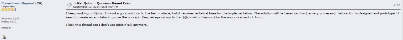 Los origenes de Qubic están de hecho, en Septiembre de 2012, en una publicación del foro de Bitcointalk donde Come From Beyond anunció Qubic.