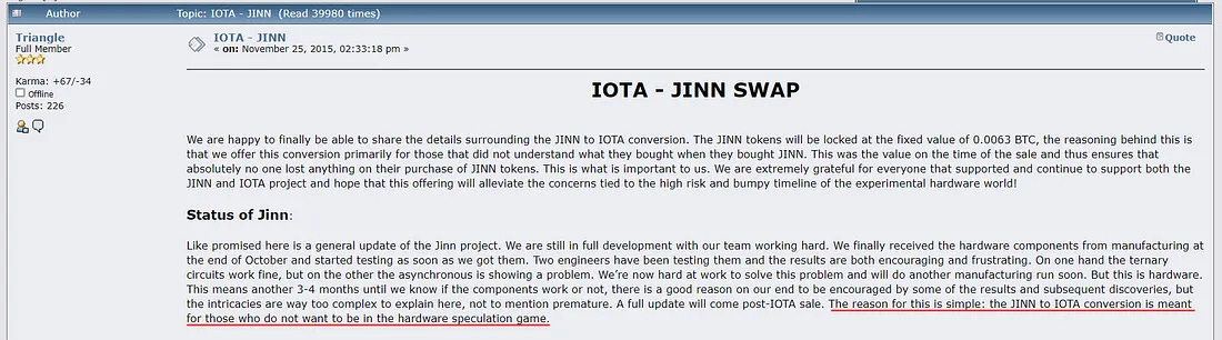 Sin embargo, ante el temor a problemas regulatorios relacionados con $JINN, que representaba una reclamación sobre las ganancias de Jinn, el equipo cambió de estrategia. En un foro de BitcoinTalk en 2015, los fundadores de Jinn anunciaron un nuevo proyecto llamado IOTA. IOTA pretendía ser "un criptotoken de microtransacciones completamente nuevo y novedoso, optimizado para el Internet de las Cosas (IdC)".