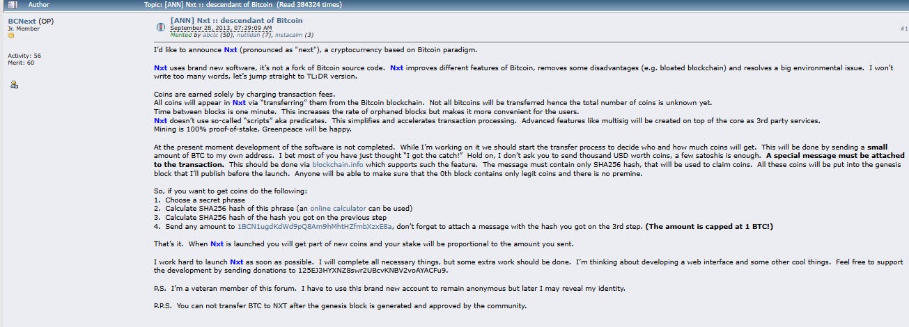 NXT fue lanzada en Noviembre de 2013 por el desarrollador de software anónimo BCNext (despues revelado como Come From Beyond). Sergey Ivancheglo inventó la prueba de participación completa y los algoritmos de staking (Proof of stake) y Nextcoin fue el primer sistema del mundo en utilizarla para alcanzar el consenso en las transacciones, por lo tanto a diferencia de Bitcoin, no se realizaba minería.